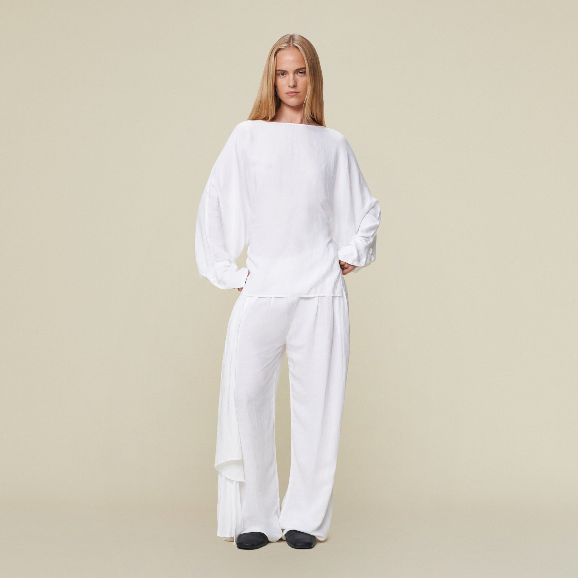 The Brisa is our linen-blend blouse with batwing sleeves and cropped back.
