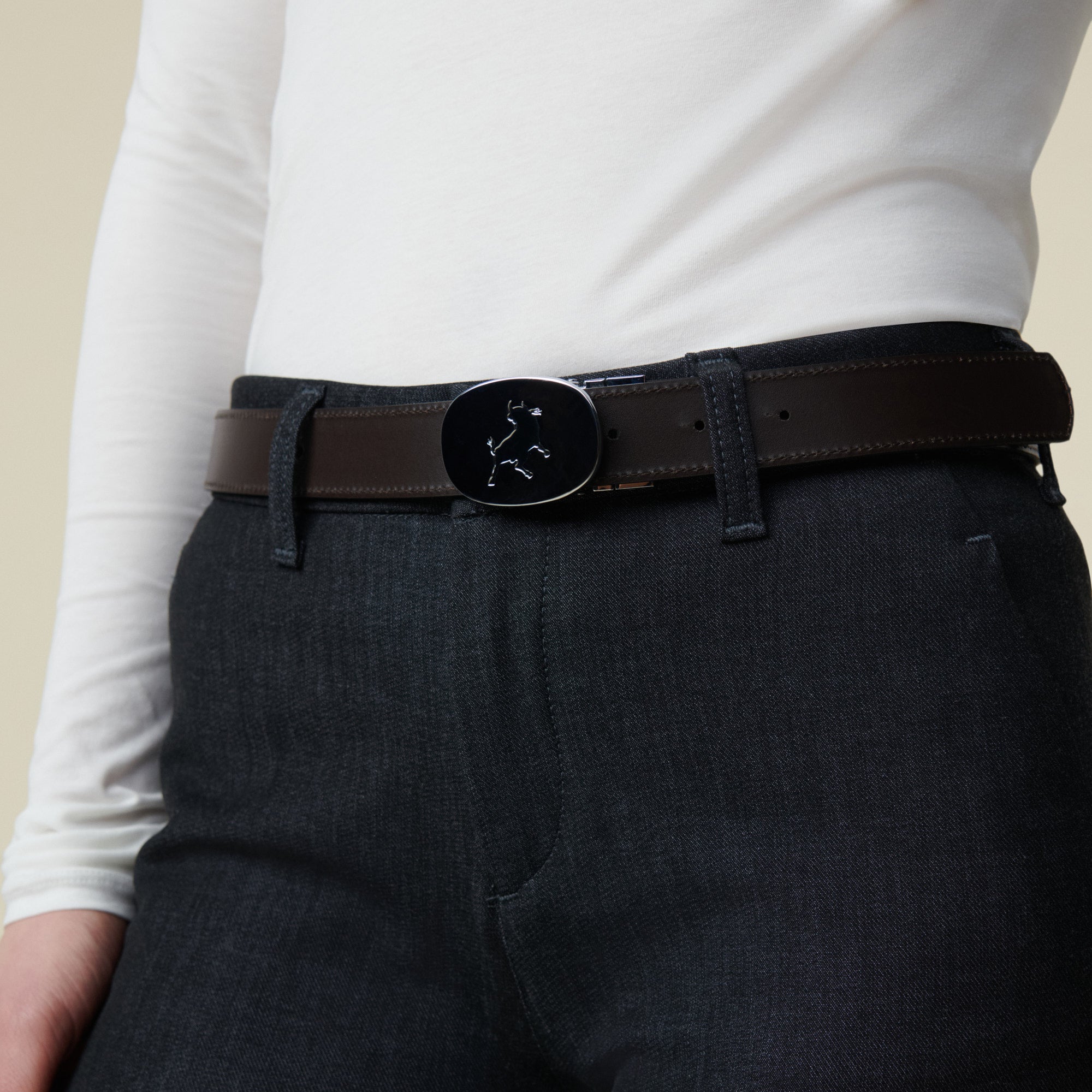 Reversible leather belt with signature bull emblem.